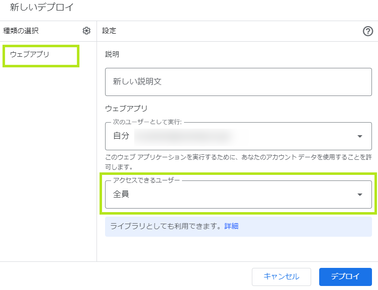 (デプロイ→新しいデプロイ→種類の選択:ウェブアプリ→アクセスできるユーザー:全員→デプロイボタン押下)