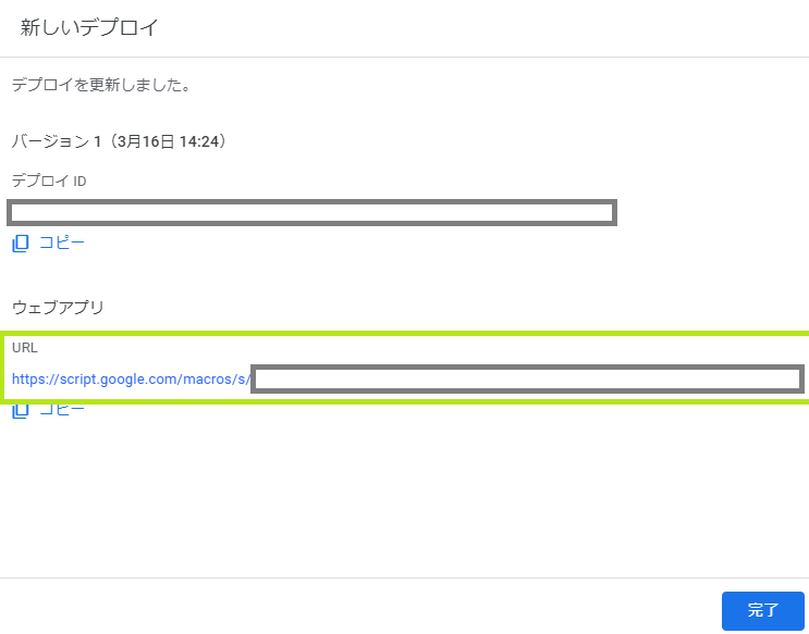 デプロイ完了画面でウェブアプリのURLをコピーしてメモ