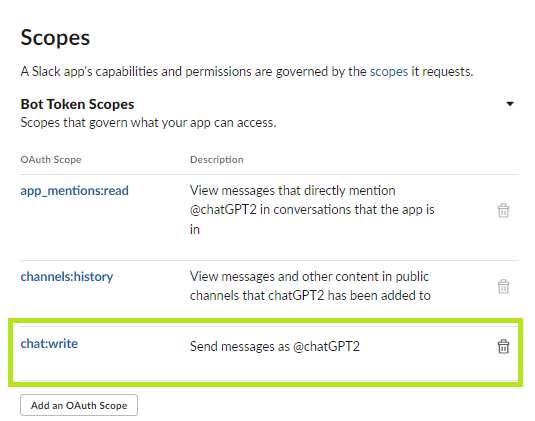 ※app_mentions:read、channels:historyが既に追加されてる場合はそのままでOK