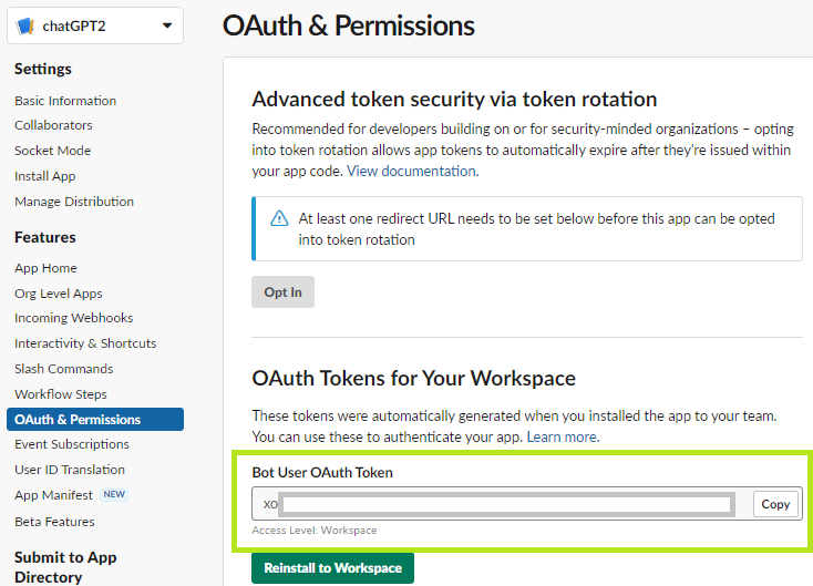 SlackBotアプリのトークンを取得します(IDのようなもの)