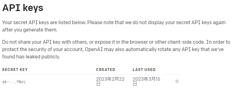 表示されたキーがAPIキーとなる。コピーしてメモしておく