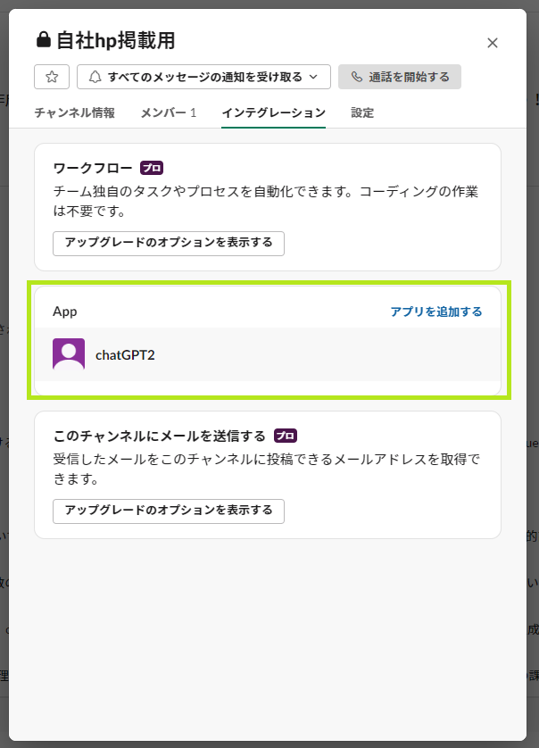 作成したSlackBot(chatGPT2)が一覧に出現するので、追加を押下