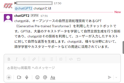 - SlackBotアプリを追加した任意のチャンネルでBotをメンションして適当なメッセージを送信