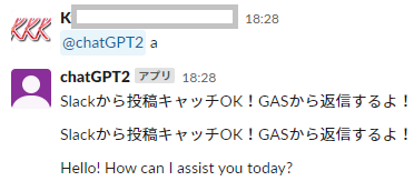 - SlackBotアプリから『Slackから投稿キャッチOK!GASから返信するよ!』という返信が届いたら通信に成功