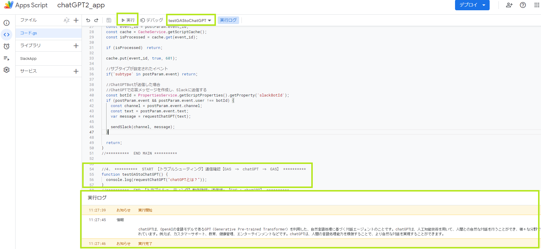 - 下部の実行ログにchtatGPTからの回答が届いたら通信に成功